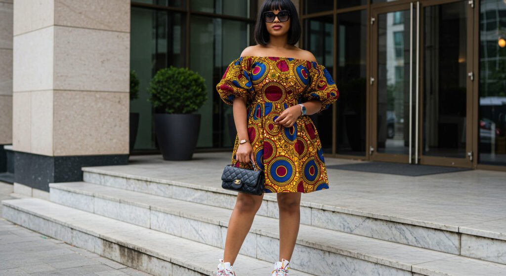 You can also style casual African print T-shirts, crop tops, or wrap skirts with plain tops. Even a pair of sneakers with African print details can transform a simple outfit into a head-turner.