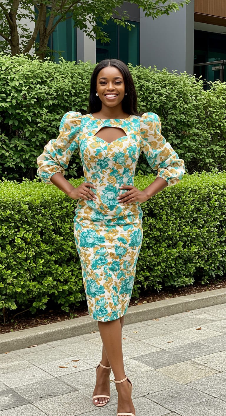 Design: Bodycon midi dress with puff sleeves, front cut-out neckline, and turquoise-gold floral brocade on cream background. Structured silhouette for a tailored fit.
