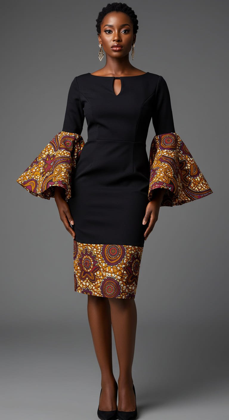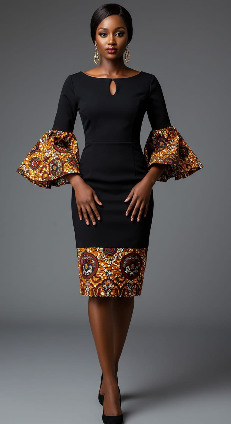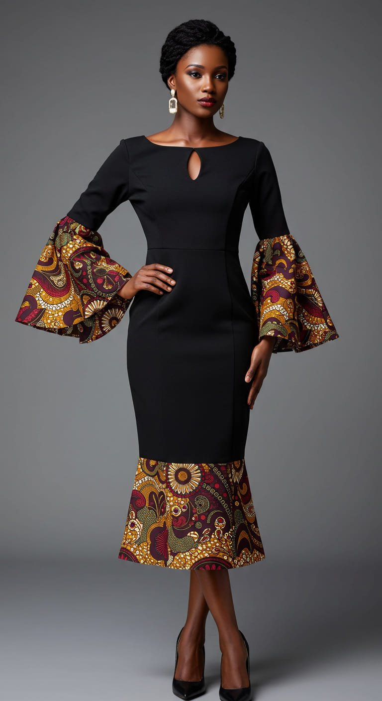 Elegant knee-length dress in black with flared Kitenge-print sleeves and a matching hem border.