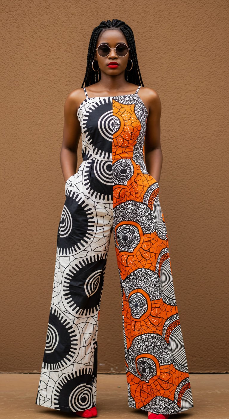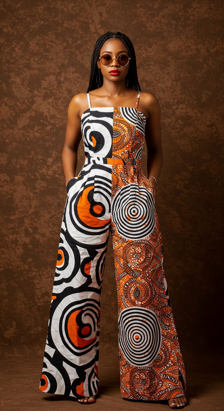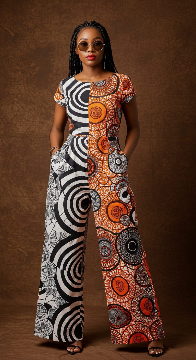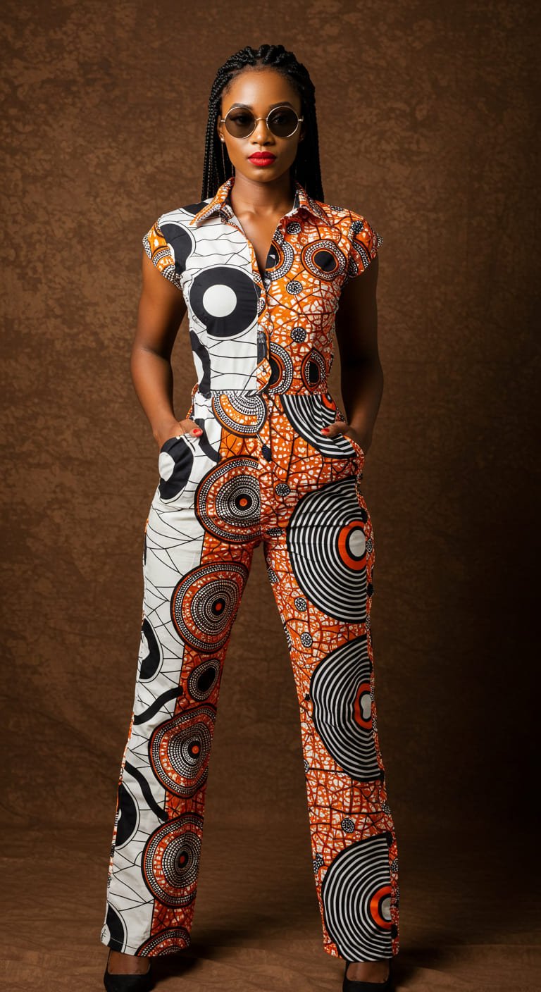 Design: Short-sleeved tailored jumpsuit featuring bold concentric tribal circle motifs in black, white, and orange. Straight-leg cut with side pockets.