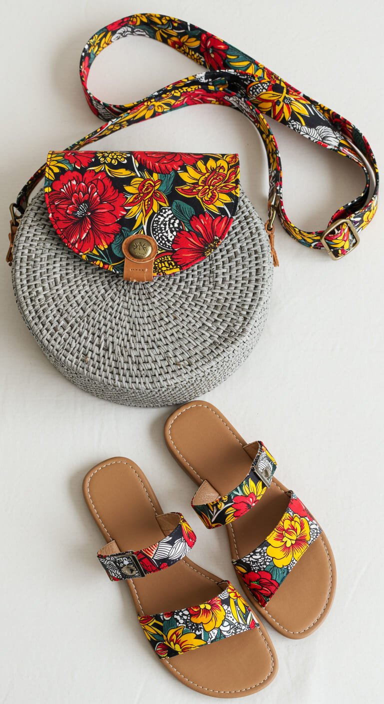 Bag: Handwoven raffia base with Ankara cotton flap and detachable shoulder strap.