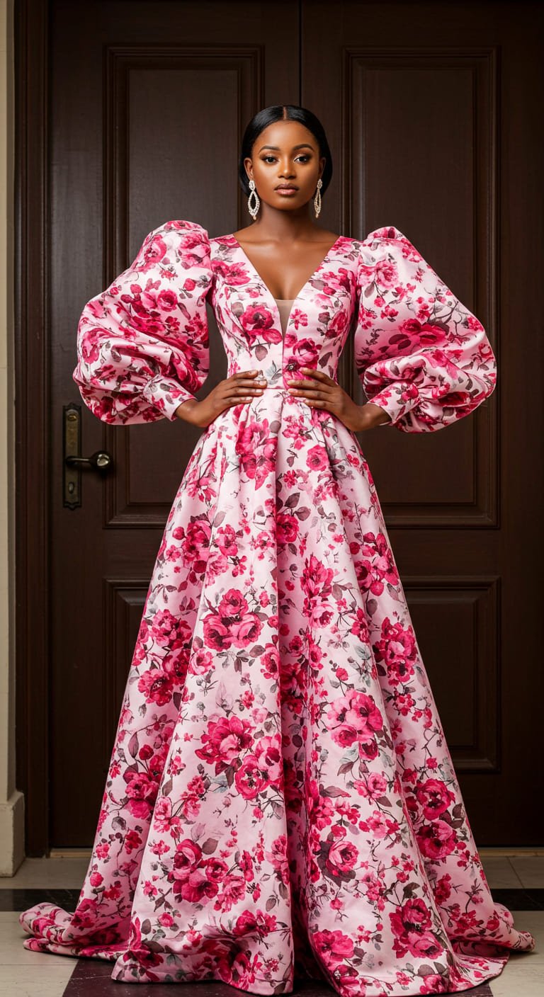 Design: Floor-length ball gown with voluminous puff sleeves, plunging V-neckline, and full A-line skirt. Pink base with bold rose prints in fuchsia and crimson. Formal evening wear.