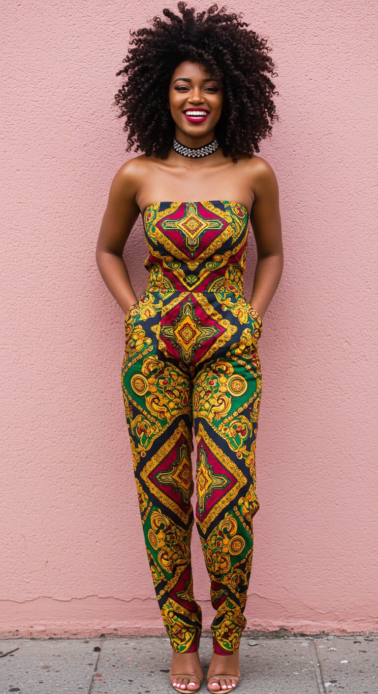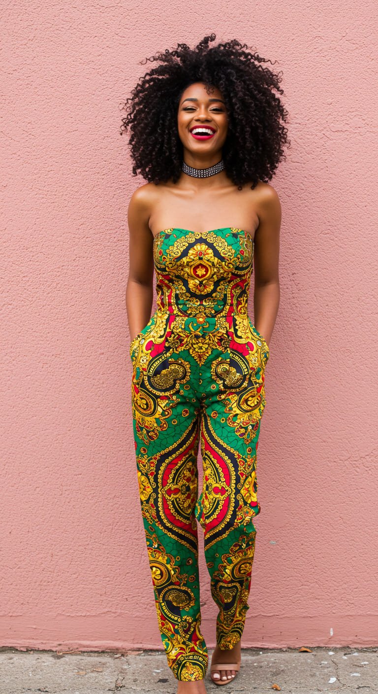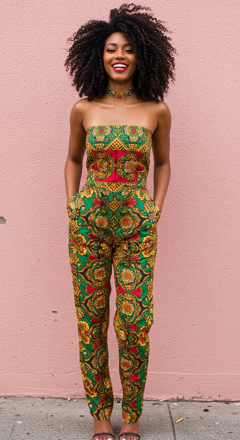 Design: Strapless jumpsuit in emerald green base with gold, maroon, and black ornate Ankara heritage patterns. Straight-leg fit with pockets.