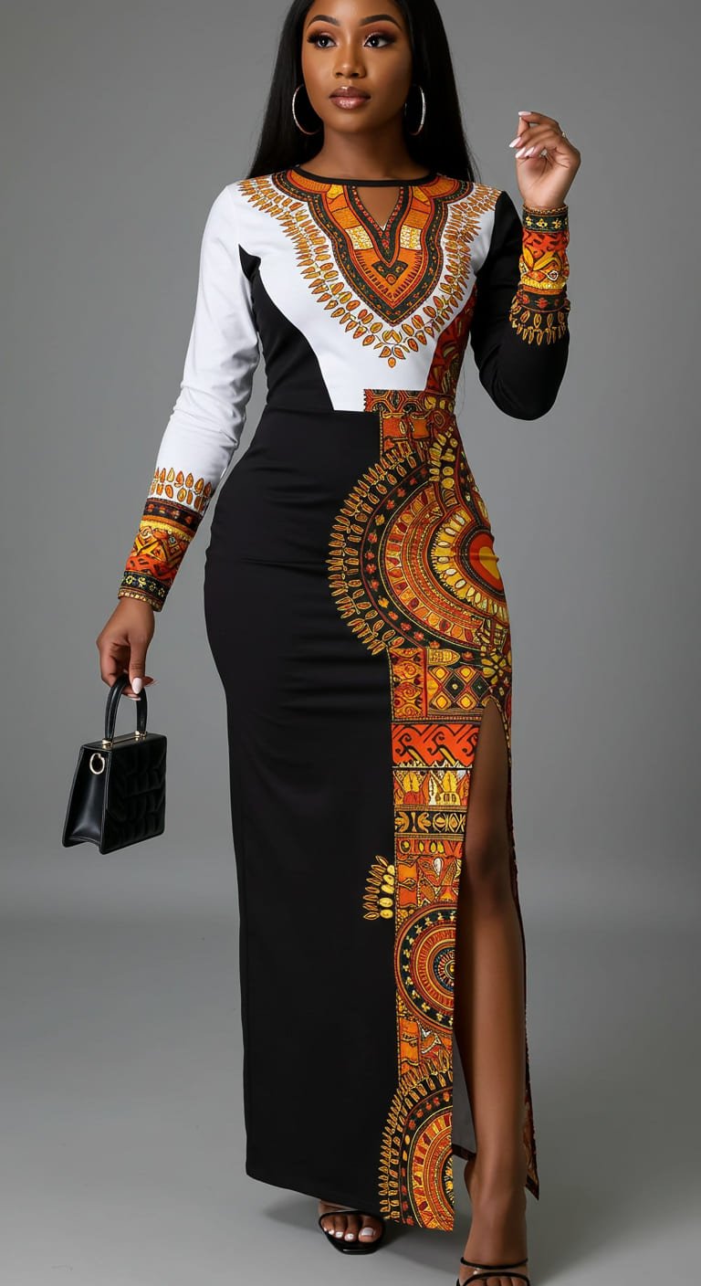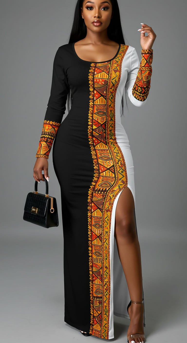 • Design: Long-sleeved floor-length gown with thigh-high slit. Split-panel black and white body with vertical Ankara strip featuring orange, yellow, and tribal-inspired motifs.