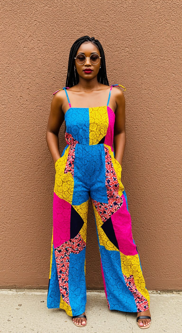 Design: Vibrant sleeveless jumpsuit with spaghetti straps and wide legs. Patchwork-style geometric prints in turquoise, fuchsia, yellow, and navy. Fun, bold, and summery.