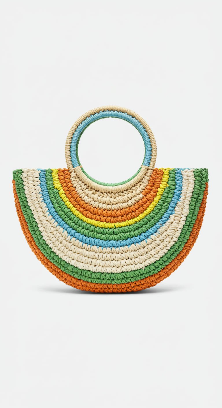 Semi-circle woven handbag with turquoise, yellow, cream, and brown stripe patterns.