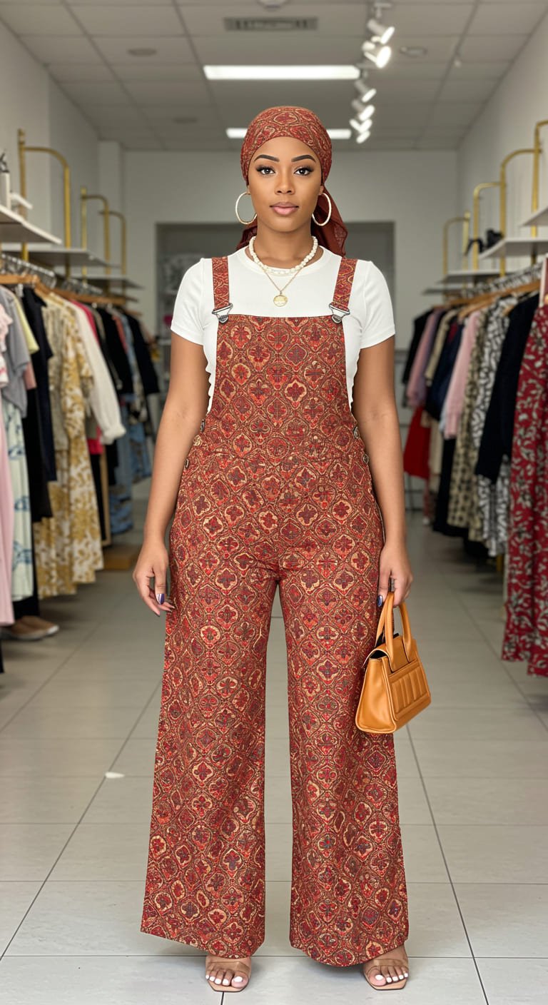 Design: Wide-leg jumpsuit with fitted bodice and relaxed flow. Rich earth-toned paisley print with red highlights. Comes with a matching headscarf accessory.